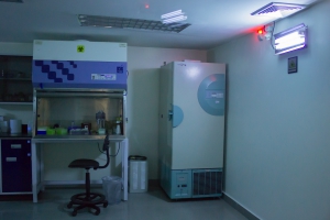 (Marca ORTOALRESA, modelo BIOCEN21 hasta 14.000rpm), posee un panel de mandos digital, de diseño ergonómico que permite una rápida lectura y su manipulación con guantes. Está dotada de motor de inducción, libre de mantenimiento, que le permite alcanzar hasta 6.000 R.P.M., con una F.C.R. 3.502 x g. pudiendo centrifugar hasta 12 tubos de 5 ml. Tiene numerosas aplicaciones de biología molecular gracias a su facilidad y versatilidad de uso, básicamente encuentra su utilidad en la separación por las altas prestaciones y fiabilidad en el proceso de centrifugado.- +Campana flujo Laminar: